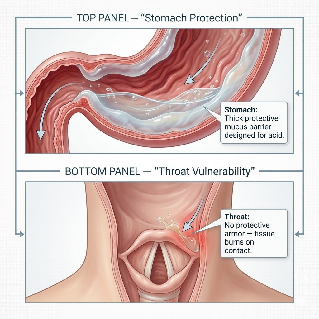 Your stomach is designed to handle acid—it has a thick mucus lining that protects it. Your esophagus has some protection. But your throat? Your larynx and vocal cords have essentially zero protective mucus layer. When even small amounts of acid reach this area (called laryngopharyngeal reflux or LPR), they cause immediate chemical burns to unprotected tissue. Your throat responds by producing excess mucus trying to protect the damaged area. This creates that constant "lump" feeling and the need to clear your throat every 90 seconds. The inflammation also causes the hoarse voice, the constant cough, the feeling like something is stuck. You can take all the medication in the world, but if acid keeps reaching this unprotected area nightly, the cycle continues. The tissue never gets a chance to heal.
