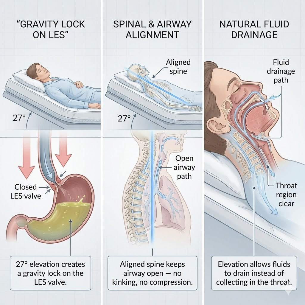 Healpurea uses a precisely engineered 27-degree incline that creates what researchers call a "gravity lock" on your Lower Esophageal Sphincter. When your upper body is elevated at this specific angle, gravity works with your LES valve instead of against it—physically preventing acid from reaching your throat even during the muscle relaxation of deep sleep.