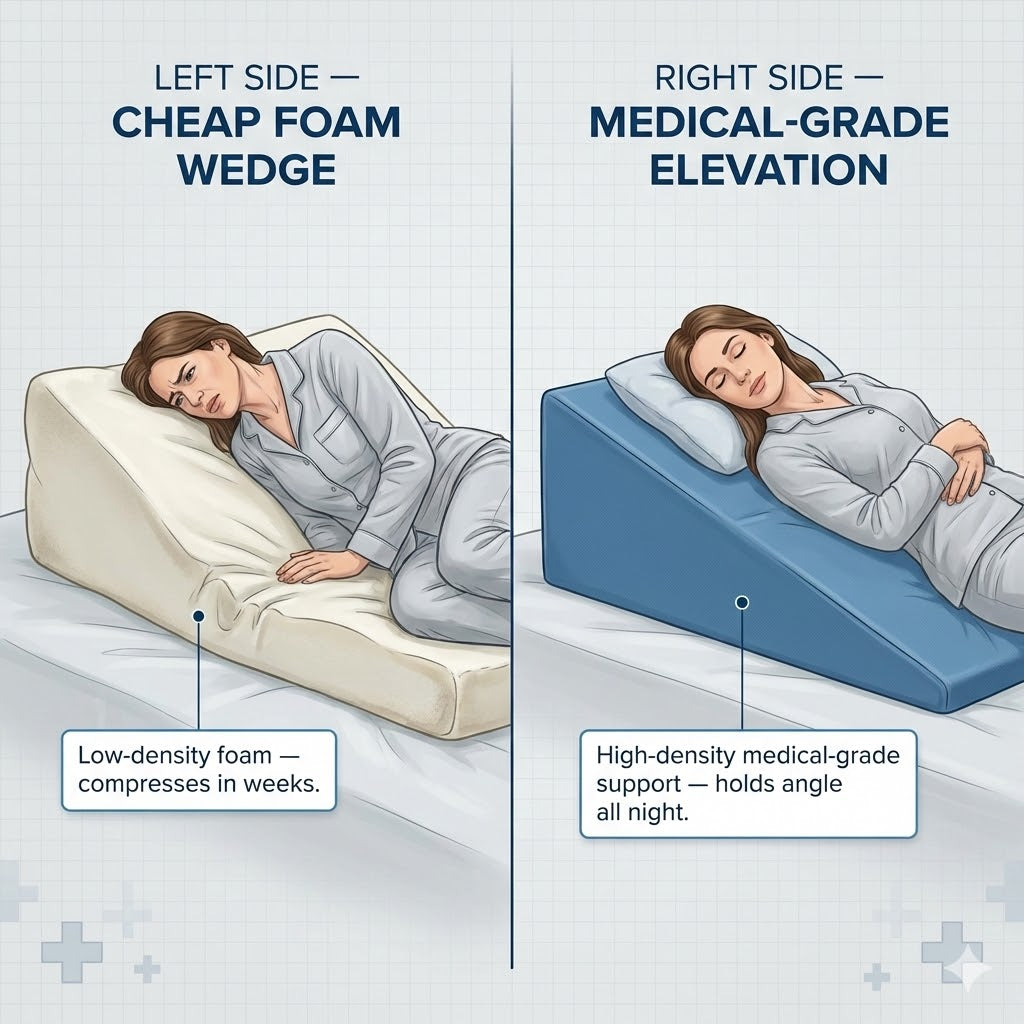 You might be thinking "I can just get a foam wedge on Amazon for $40." Here's why that won't work: those cheap wedges use low-density furniture foam that compresses under body weight within a week. They emit chemical odors that irritate your already-sensitive throat. They don't maintain the precise 15-30 degree angle proven effective in clinical studies—they just kind of prop you up at whatever random angle. Medical-grade elevation pillows like Healpurea use hospital-grade, high-density memory foam specifically engineered to maintain structural integrity under weight for years. The 27-degree angle is precisely calculated based on biomechanical research on airway geometry and lower esophageal sphincter pressure. The materials are hypoallergenic and respiratory-safe. This isn't about being "fancy"—it's about whether the product can physically do what you need it to do for 8 hours every single night.